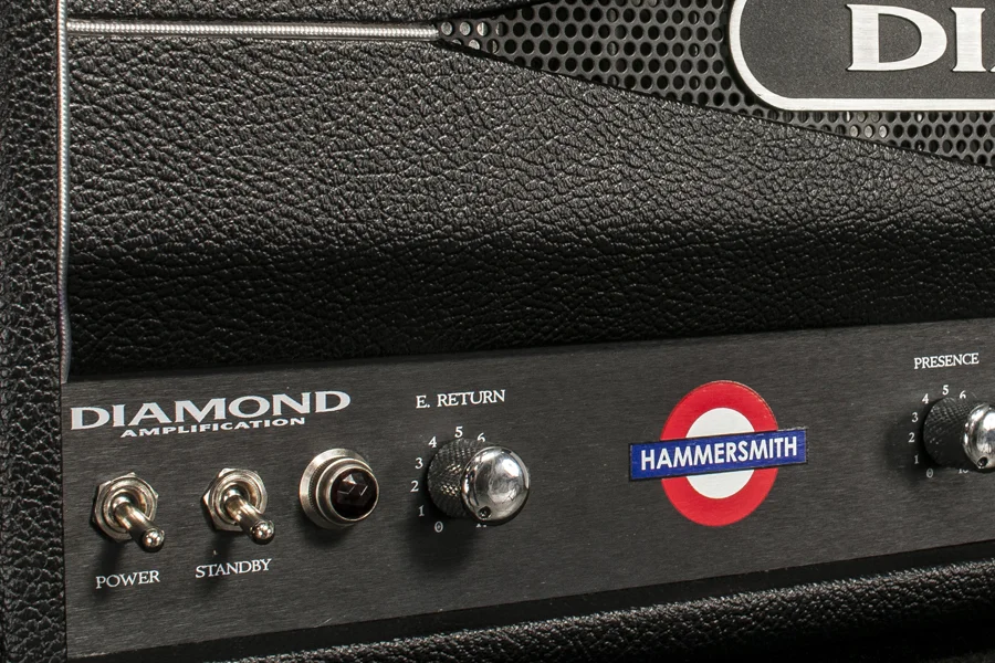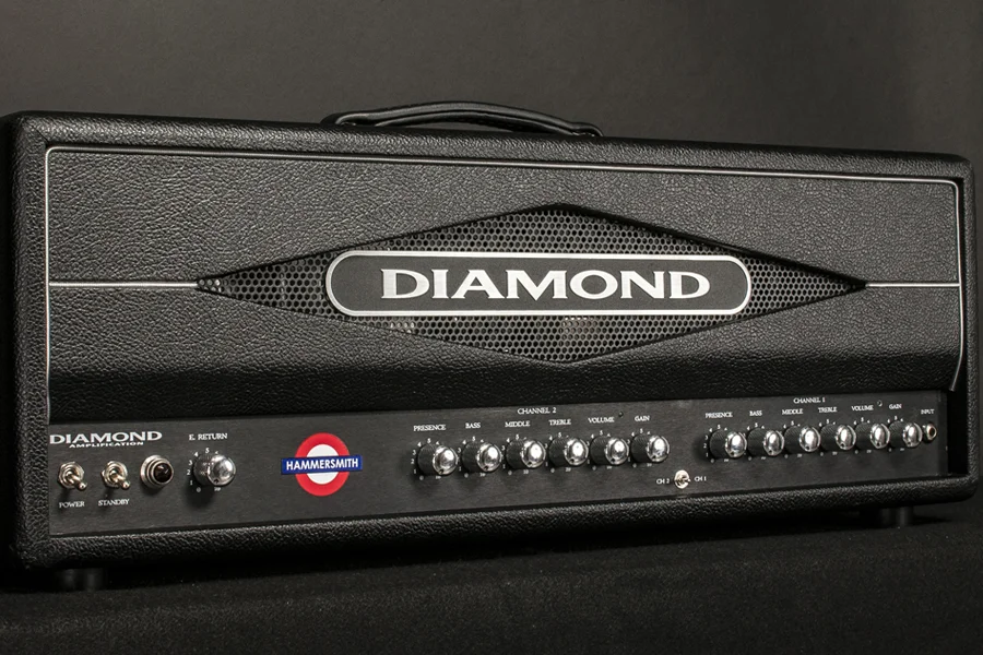 The head features a perforated metal grille set in Diamond’s new Diamond-shape Tolex wrapped front panel, and an accompanying black grille on the back finished in black powder coating. Even the knobs are metal for look and feel.